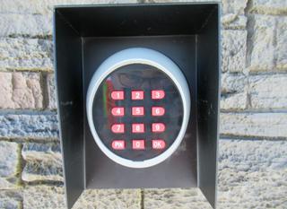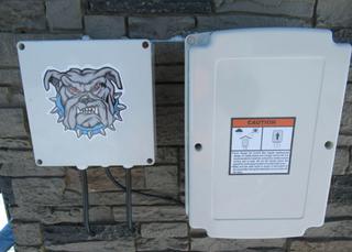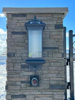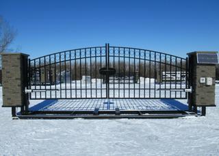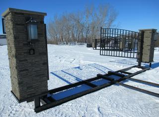Lot #0680: Unused Bulldog Industries 20 Ft. Entrance Gate w/ Faux Stone Pillars, Buried Frame w/ Heavy Duty 3/16 In. Steel Construction, 30W, 24V Solar Panel And Gate Openers, 24V Battery Powered, Solar or 120V AC Charger, (4) Gate Remotes, (2) Solar LED Post Lights, Wireless Keypad, Adjustable Opening Angle, (2) Arm Actuators w/ Mounting Hardware, Control Box **Item Located Offsite Near Innisfail AB, Call Chris For More Information 587-340-9961**