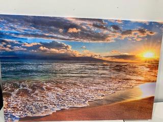 Lot #6255: Unused Beach Sunrise White Wave Canvas Wall Art, 24 In. x 36 In., Ready To Hang w/ Invisible Hooks On Back of Canvas Panel (Office)