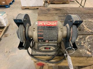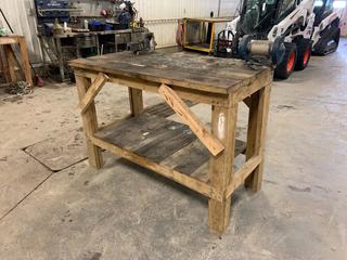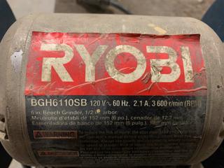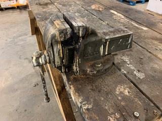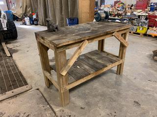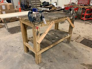Lot #1269:     60in X 30in X 42in Wood Work Bench c/w Henry 4in Bench Vise And Ryobi 120V 6in Bench Grinder
