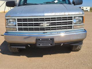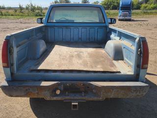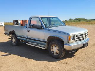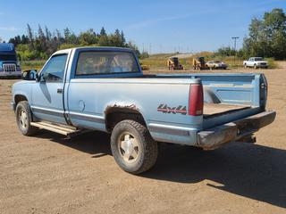 Lot #0107: 1989 Chevrolet 1500 4X4 Pickup c/w V8 Gas Engine, A/T And 265/70R16 Tires. Showing 430,934kms. VIN 2GCEK14H1K1120371 *Note: No Tailgate, Rust Throughout Body, Seat Torn, Rearview Mirror Not Attached* (FORT SASKATCHEWAN YARD)