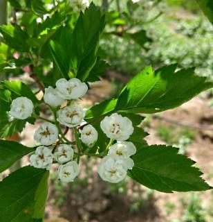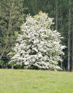 A small upright rounded tree with deeply lobed dark green glossy foliage with yellow fall colour. Double white clusters of flowers in spring are followed by sparse red berries. Very cold hardy. Developed by Agriculture Canada at the Morden Research Station. Prairie Hardy.