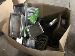 Lot #1141: Pallet of Asst. Commercial Kitchen Supplies including Asst. S/S Inserts, Pots, Pans, CO Alarms, etc.