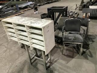 Lot #4693: Lot of Asst. Stools, Stands, Chairs, Shelves, etc.
