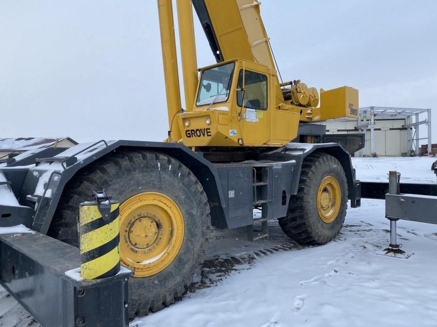 1982 Grove RT-980 Rough Terrain Crane 80 Ton c/w Swing Away Jib, Crane Smart System, Loadwise 610 Meter, 6 cyl, rooster sheave, 6 sheave block, 36 ft - 114 ft 4 sec boom, anti two-block, aux hyd, hyd outriggers, 33.25x35 Showing 3482 hrs, S/N 48763