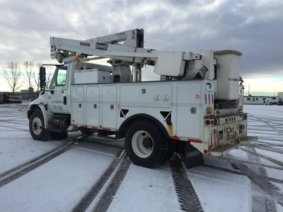 2006 International 4300 S/A Bucket Truck c/w DT466, Auto, A/C, Hi-Ranger TL44M, 11R22.5 Tires. Showing 151,860 Kms. Unit # U5614.