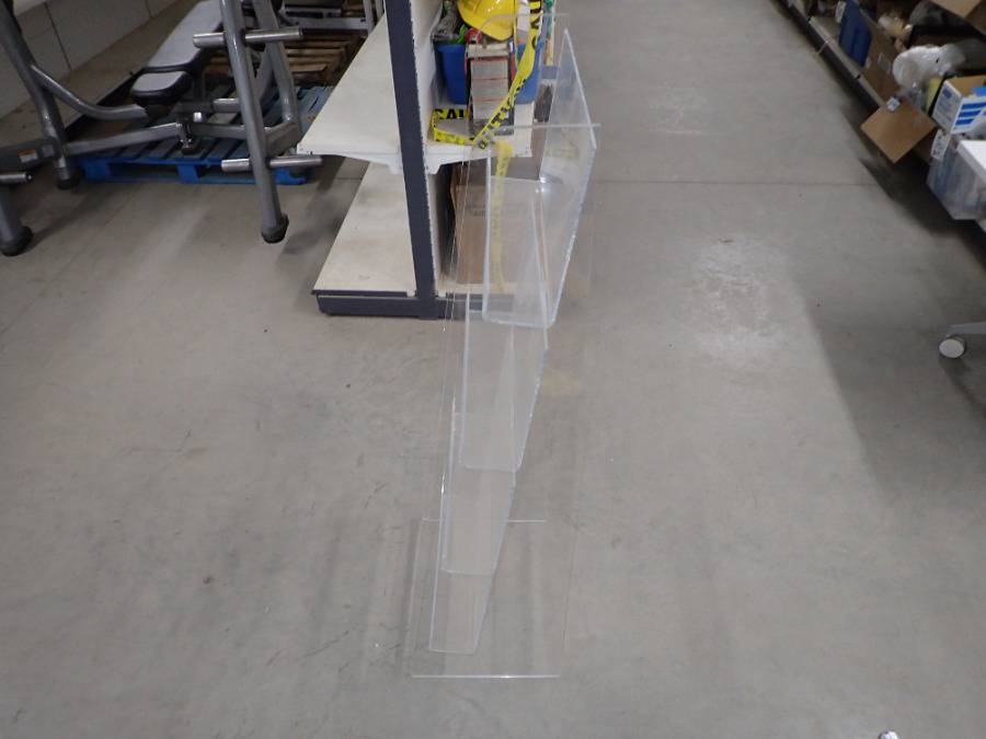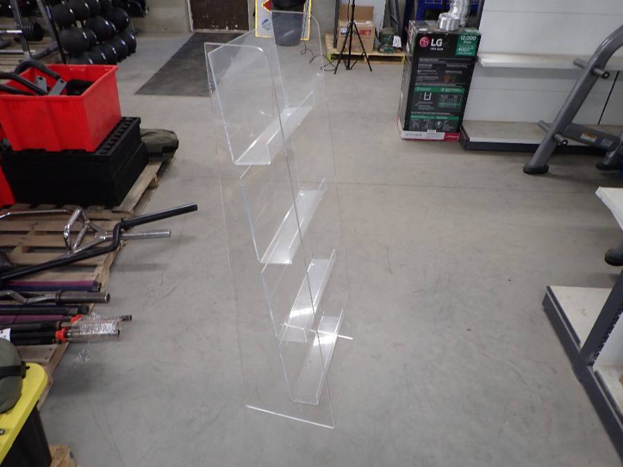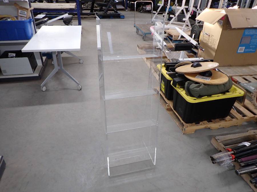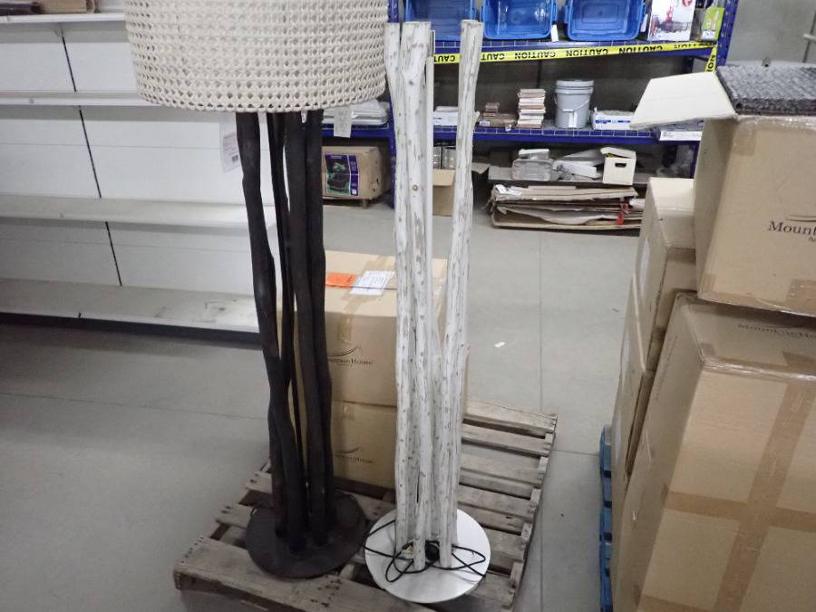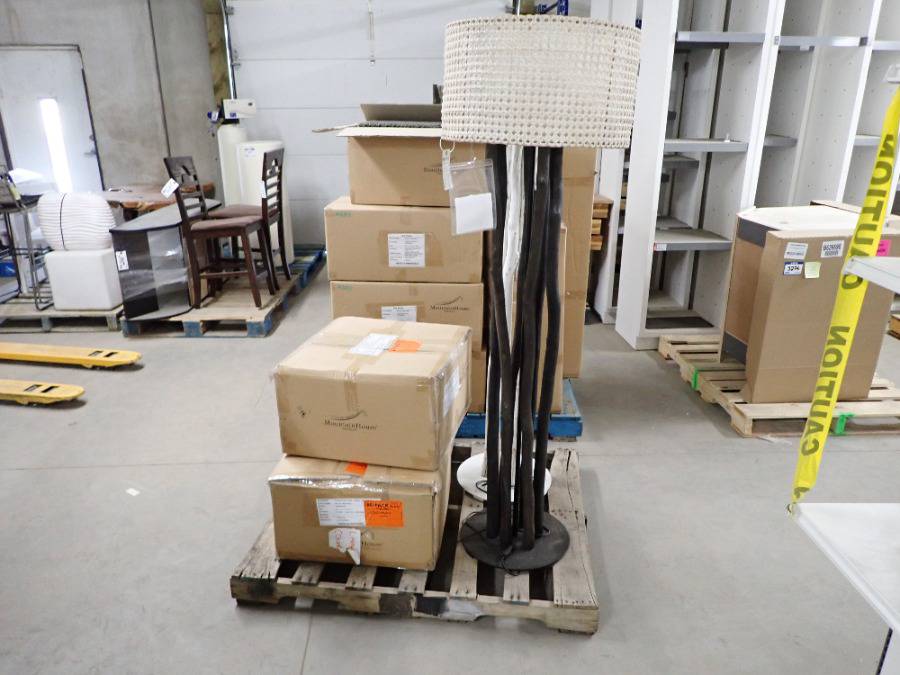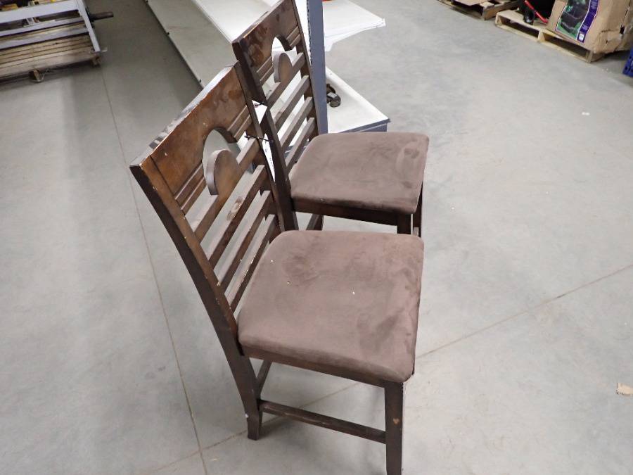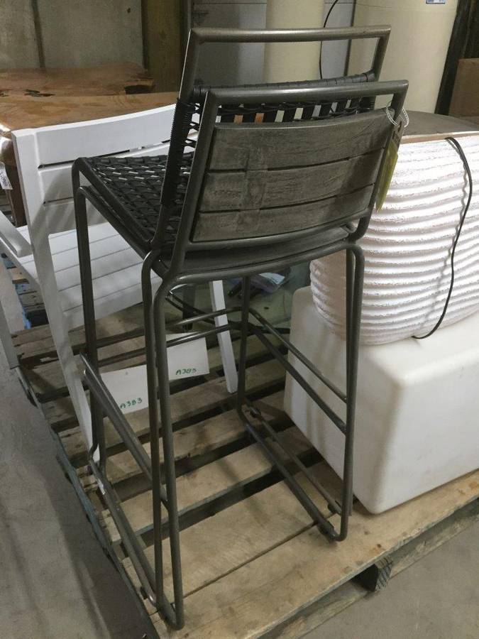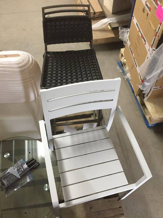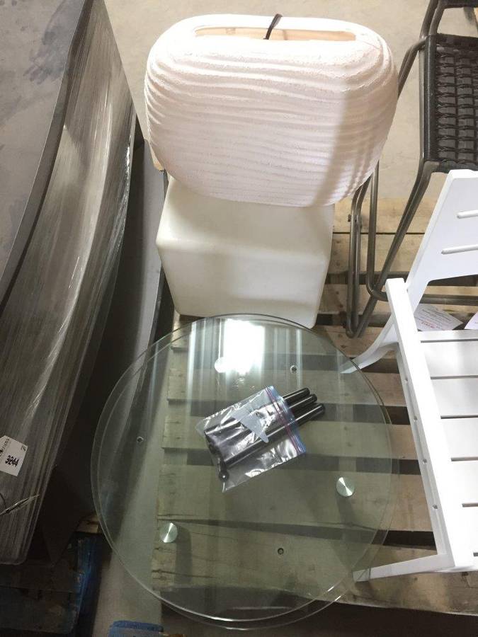 (1) Round Glass Short Table, (1) White Square Plastic Stool, (1) Lamp, (2) Barstools & (1) White Metal Chair.