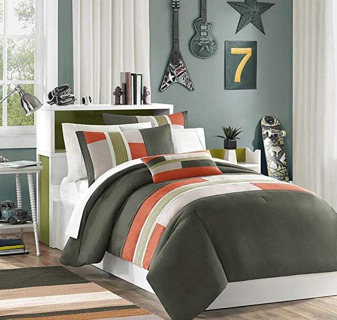 Mi-Zone Duvet Cover Set Kids - Olive Green, Striped Pieced ? 4 Piece Bed Set Cover- Full/Queen