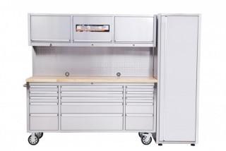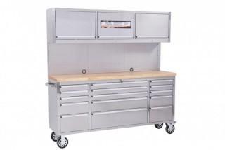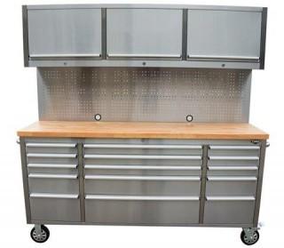72" Stainless Steel tool Chest w/ 15 Drawers & 3 Overhead Cabinets with Wood Top & Pegboard